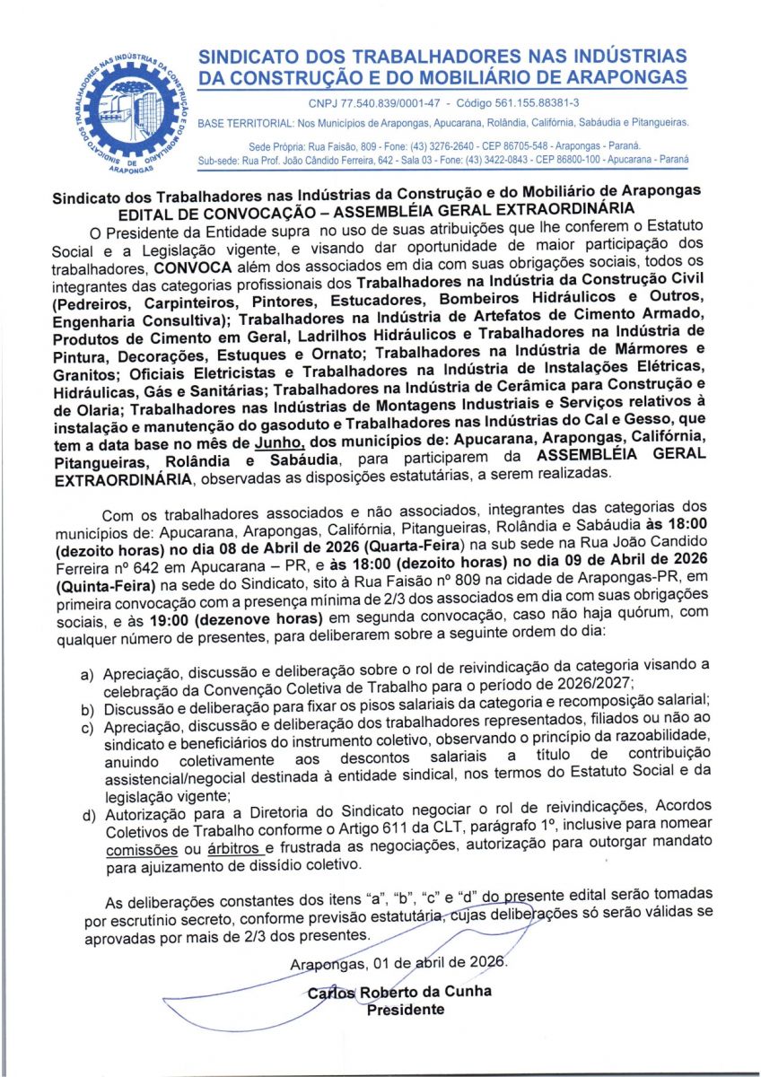 Seu Sindicato de Classe convida para Assembleia Geral Extraordinária na Cidade de Arapongas dia 09/04/2026 sito Rua Faisão 809 às 18:00 em primeira convocação e às 19:00 em segunda convoação e na cidade de Apucarana no dia 08/04/2026 às 18:00 em primeira convocação e às 19:00 em segunda convoação, na Rua João Candido Ferreira nº642, para tratar da Pauta de Reivindicação para o ano de 2026-2027.