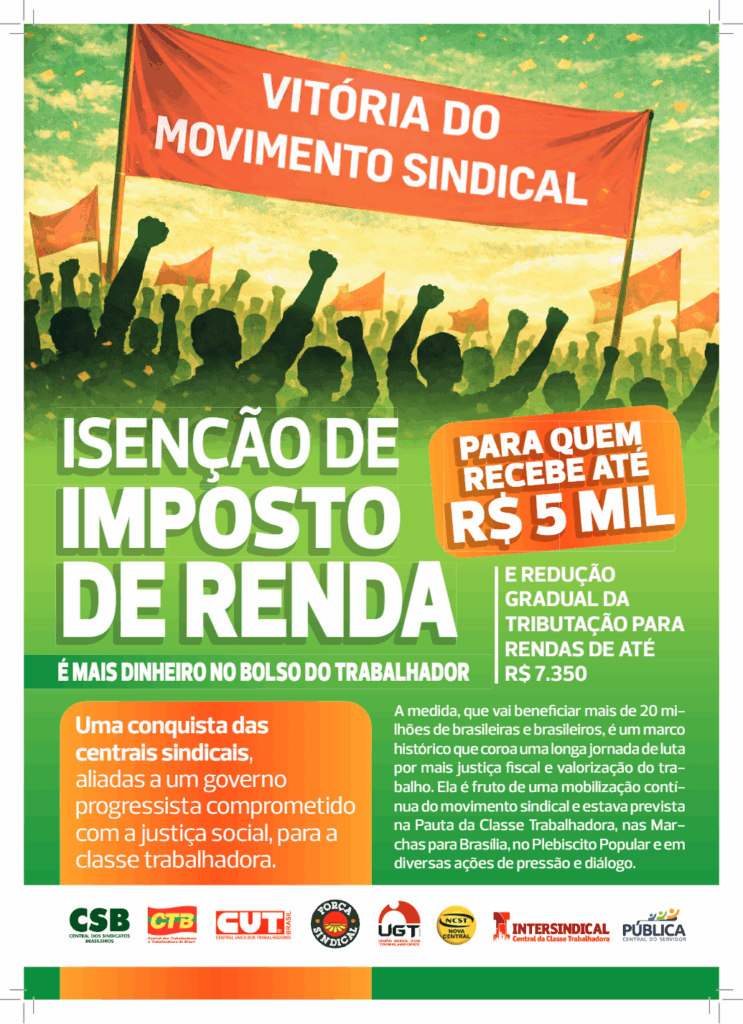 A conquista da isenção do Imposto de Renda (IR) para trabalhadores que recebem até R$ 5 mil foi celebrada pelo movimento sindical nesta quinta-feira (5).